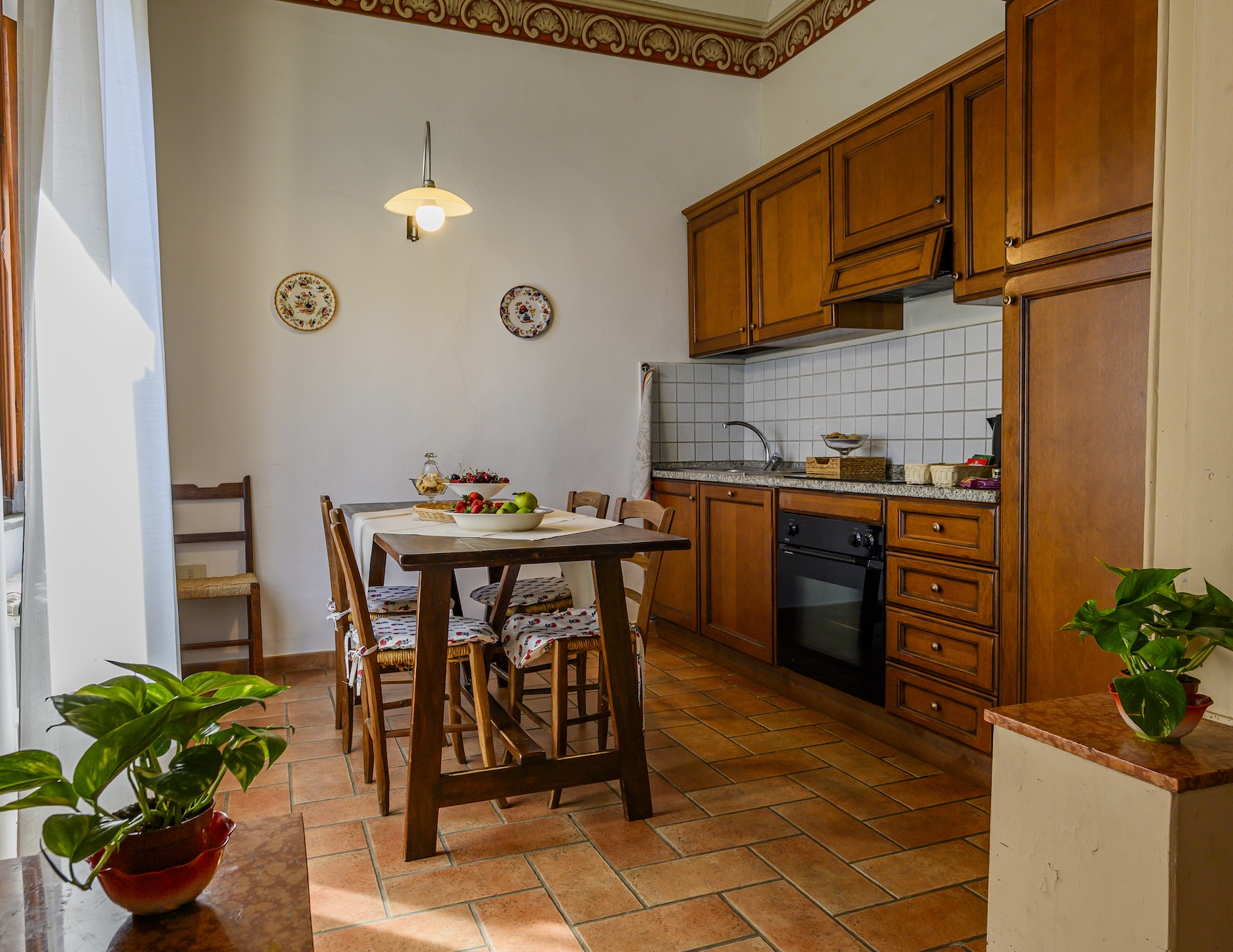 L’appartamento, di circa 68 mq., è costituito da un ampio soggiorno con camino, una cucina abitabile, comunicante con il soggiorno attraverso un arco, una camera con cabina armadio e due letti singoli accoppiati (che possono agevolmente essere trasformati in un letto matrimoniale), una camera a due letti a castello e un piccolo ripostiglio. Tutte le camere hanno vista giardino e le finestre sono munite di zanzariere. Il bagno è dotato di bidet e di una vasca-doccia. Si accede all’appartamento, sito al primo piano, dal portone centrale e dalla scala interna della casa. L’appartamento ospita comodamente quattro persone. In casi eccezionali, e su precisa richiesta, nel soggiorno può essere approntato un divano-letto per un bambino.
